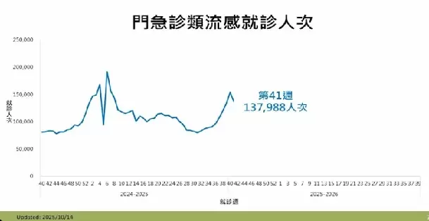 隨著10月連續假期來臨,民眾出遊與聚餐活動增加,各類傳染病傳播風險提高。統計顯示,今年公費流感及新冠疫苗接種人數已突破去年同期紀錄,疾管署將增購20萬劑流感疫苗,預計11月上旬配送完成。 2025年第41週(10月5日至11日)類流感門急診就診人次達137,988人次,較前週下降10.2%。(圖/疾管署)...